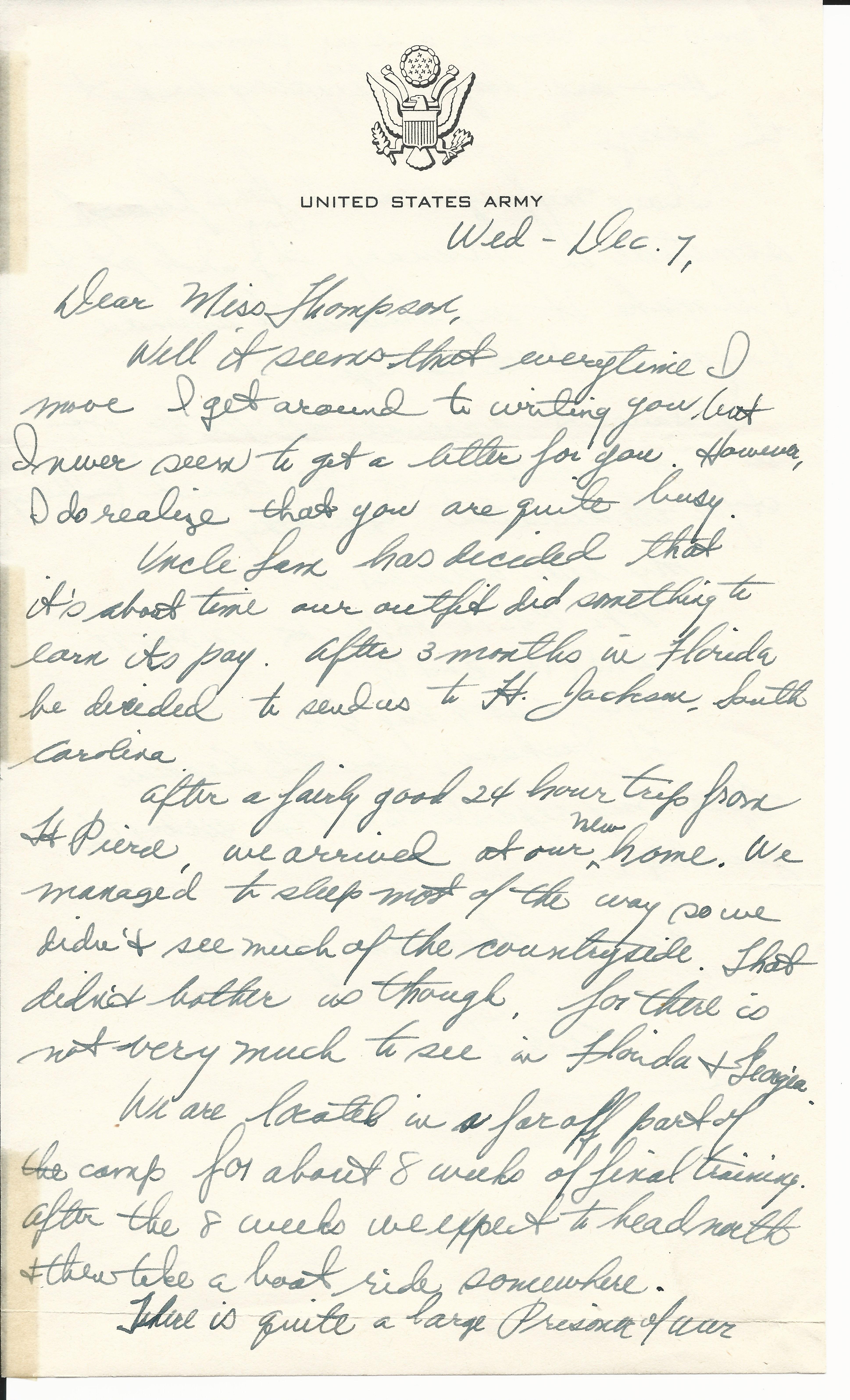 Uncle Sam has decided that itb s about time our outfit did something to earn its pay. After 3 months in Florida he decided to send us to Ft. Jackson, South Carolina.