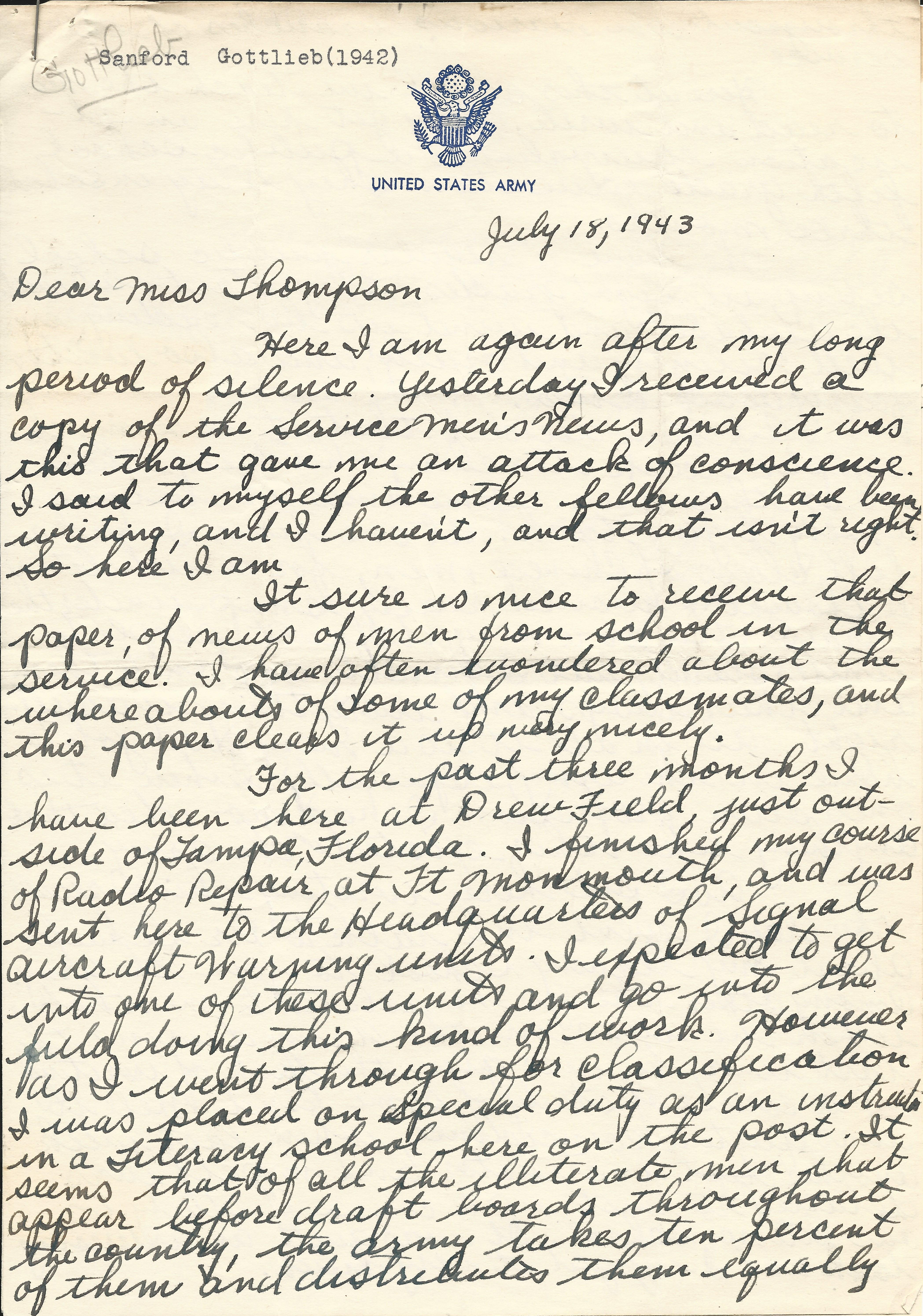For the past three months I have been here at Drew Field just outside of Tampa, Florida. I finished my course of Radio Repair at Ft. Monmouth, and was sent here to the Headquarters of Signal Aircraft Warning units. I expected to get into one of these units and go into the field doing this kind of work. However as I went through for classification I was placed on special duty as an instructor in a literacy school here on the post. It seems that all of the illiterate men that appear before draft boards throughout the country, the Army takes ten percent of them and distributes them equally throughout the various branches of the service.